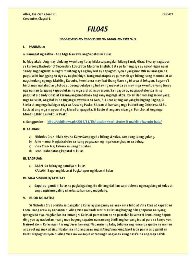 Balangkas Ng Pagsusuri Ng Maikling Kwento Pdf